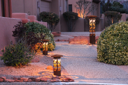 Attraction Lights 4×4 and 6×6 Series fixtures safely light the driveway and walkway for this beautiful home in the red rock country of Sedona, AZ. The homeowner is a local artist who desired to make an artistic statement in her landscape with our bollard style fixtures!