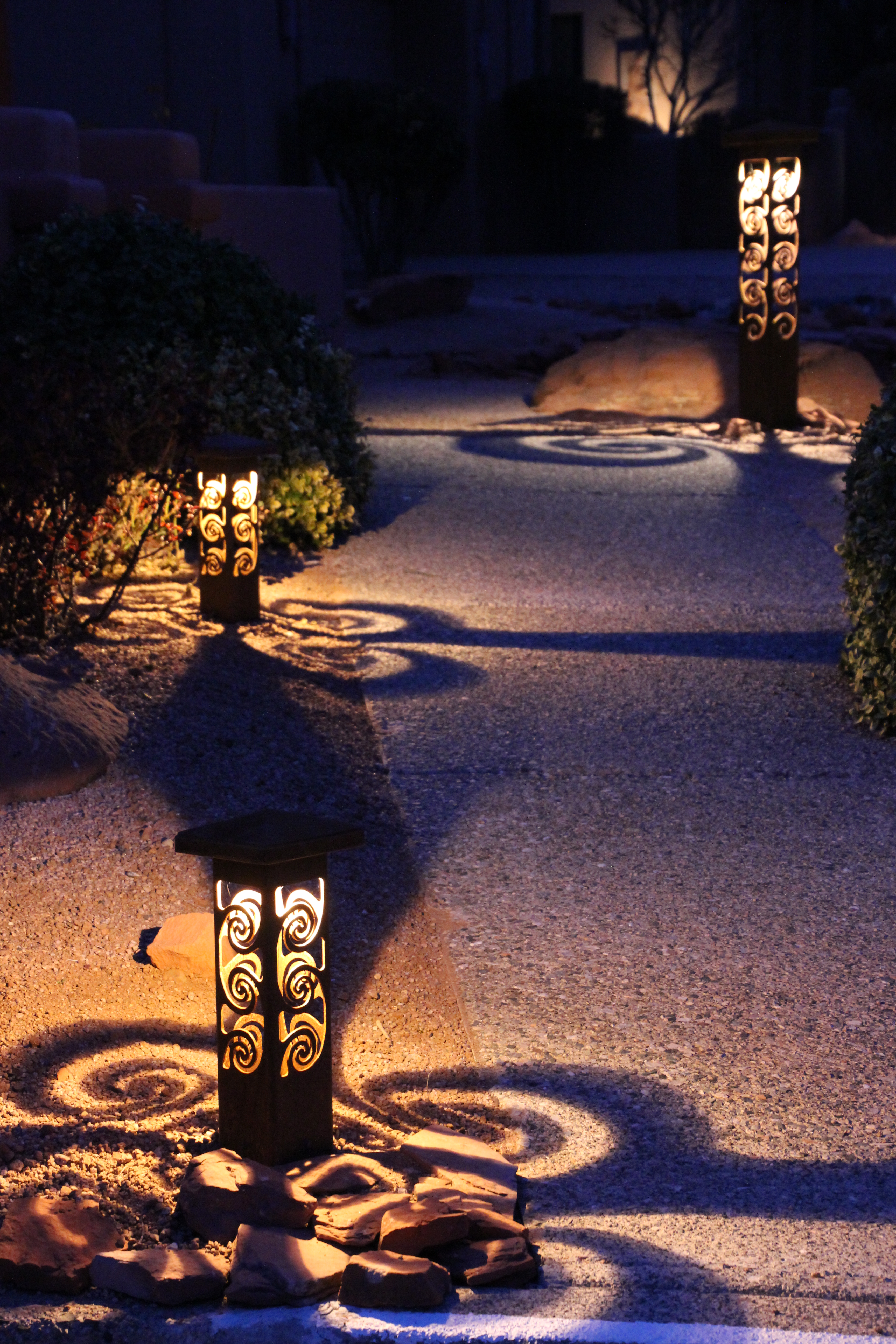 Lights are all 12 volt: Two Swirls 4x4x17” (above) light the walkway and the step at the driveway. A 4x4x25 could also have been used by the driveway to give even more lighting spread. The Swirls 6x6x42” is the focal point, drawing the eye down the walkway. When you arrive at the bend there is the added drama of a larger Swirl projected on the ground.