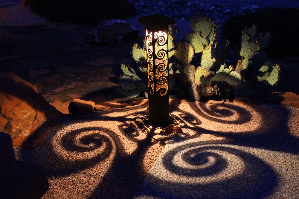 Changing fixture graphics? Our client liked the idea of seeing variety in the fixtures in her yard. We chose two designs: Swirls and Aspen. The Swirls design is featured along the walkway where the shadows can be appreciated up close. Aspen 6×6 bollards are the featured landscape elements in other areas to expand the views. Example: An Aspen 6x6x34” (see below) is used at the property corner. An Aspen 6x6x26” is enjoyed by the front door as well, adding a courtyard sculpture to view from inside the house.